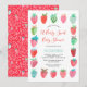 Este design de morango doce apresenta um convite de chá de bebê de morango doce e moderno com morangos pintados à mão em vermelho e rosa com pequenos detalhes em azul e verde. Veja toda a coleção para mais itens correspondentes! Arte original de Caroline Bonne Müller