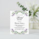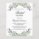 Um fundo branco. Decorado com flores de lavanda violeta e verde de eucalipto. Personalize e adicione um nome e detalhes da parte. O nome é escrito com um script de estilo manuscrito. 1 folha de papel = 1 convite impresso borda a borda.