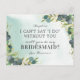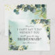 Está a pensar em pedir a alguém para ser sua dama de honra no seu futuro casamento, então por que não escolher esses cartões-postais rústicos de convite de dama de honra com tema de greenery. Este convite personalizado fará com que sua amiga, irmã, prima, sobrinha, filha ou quem quer que você escolha se sinta ainda mais especial. Este cartão apresenta elegantes folhas de eucalipto botânico em aquarela, respingos de dourado e a frase "Não posso dizer 'eu aceito' sem você".
