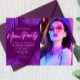 Convite minimalista com luzes de Neon no título para dar ao convite um visual tentador com violeta escuro ao fundo com folhas tropicais cintilantes combinando