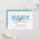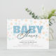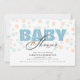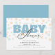 Este convite de chá de fraldas é perfeito para a chegada de um menino. A design oferece um olhar moderno com a palavra "bebê" aparecendo em azul claro e o fundo é um padrão de pontos em cores pastéis moles.