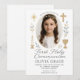 Celebre o marco sagrado de sua filha com este elegante convite de Primeira Comunhão. Apresenta uma delicada borda recortada, ilustrações religiosas em dourado suave (cruz, vela, cálice) e uma moldura de foto oval. Perfeito para comunhão tradicional, rústica ou moderna