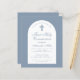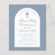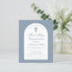 Um convite de primeira comunhão moderno. Sobre um fundo azul desbotado, tem um arco branco com texto azul desbotado no interior. A ocasião e o nome estão escritos numa elegante caligrafia; a primeira linha é um texto arqueado.