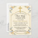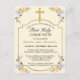 Celebre a Primeira Comunhão de sua filha com amigos e familiares convidando-os com este elegante cartão-postal de convite de Primeira Comunhão em falso ouro. Este convite de Comunhão apresenta uma bela cruz dourada com uma moldura dourada contra um fundo amarelo suave com flores em aquarela com tons de pêssego e azul em cada canto. Coloque seu nome e endereço de retorno no verso deste cartão-postal de convite para Comunhão para um envio fácil.