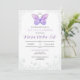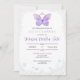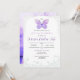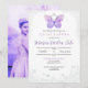 Um convite para a Quinceañera simples e elegante. Apresentando uma borboleta lilás com coroa de prata rodeada por uma borda de jardim que permitirá que seus convidados facilmente encontrem toda a informação necessária para o seu grande evento. Os números Romanos "XV" representam as 15 primaveras da aniversariante. O lado traseiro é o lugar perfeito para subir uma foto da bela Quinceañera.