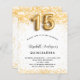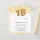 Para uma Quinceañera elegante, festa de 15 anos. Um fundo branco chique. Decorado com brilho dourado falso, faíscas. Personalize e adicione um nome, idade e detalhes da festa. O nome é escrito com um estilo de letra manuscrita. Número 15 com fonte estilo balão.