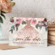 Postais de convite de Quinceañera com flores modernas. Design com vestido dourado rosa, elementos florais em um fundo pérola brilhante. Personalize com sua foto e detalhes no verso.