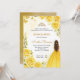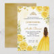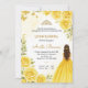 Convite de Quinceañera com rosas amarelas elegantes e desenho de vestido. O texto inclui detalhes do evento. O fundo é uma superfície clara, semelhante ao mármore.
