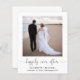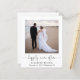 Simples e elegante anúncio de casamento ou fuga romântica com orçamento acessível e convite para recepção ou festa pós-casamento. A frente apresenta sua foto, "felizes para sempre" em uma fonte estilosa com floreios e seus primeiros nomes, data e local do casamento. No verso, personalize seu anúncio de casamento e convite para recepção ou festa, insira o URL do seu site de casamento para criar um código QR para que os convidados leiam e vejam suas fotos de casamento, todos os detalhes e respondam online e assinem seus nomes de casados em uma fonte semelhante a uma assinatura.