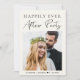 Elegante anúncio de casamento / elopamento pequeno e convite para recepção / festa de celebração em creme claro. A frente apresenta sua foto de casamento e "Festa Feliz para Sempre" em uma mistura de tipografia simples e um script moderno e chique. Abaixo da sua foto, adicione seus nomes e data de casamento. No verso, personalize sua mensagem e adicione detalhes da festa ou recepção e seus nomes em um script semelhante a uma assinatura.
