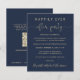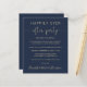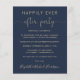 Convite à recepção de casamento azul marinho favorável ao orçamento. A frente apresenta "Felizmente, Nunca Depois da Festa" numa mistura de uma simples tipografia dourada e uma elegante escrita dourada com baloiços e nomes num guião semelhante a uma assinatura. No verso, adicione seu endereço de site de casamento para criar um código QR para os convidados pesquisarem para acompanhar suas fotos de casamento, todos os detalhes e para RSVP on-line, e adicione seus primeiros nomes e datas de casamento e recepção.