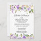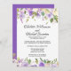 Flores roxas escuras, rosas roxas claras e flores brancas marfim estão aninhadas em uma variedade de folhas e galhos. Elas criam uma bela borda floral ao longo da parte superior e inferior deste convite de recepção de casamento furtivo. A parte de trás do convite é roxo real com pontos brancos muito pequenos. A borda floral continua ao longo da parte inferior.