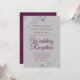 Este convite simples é projetado para convidados convidados para a recepção, mas não para a cerimônia de casamento em si. Ele apresenta um design elegante e sofisticado com letras em magenta, roxo cassis ou cor de amora em um fundo cinza e enrolamentos e espirais de pseudo-folha de prata ornamentados nos cantos. Uma maneira linda de convidar seus amigos e familiares para celebrar com você!