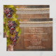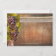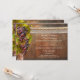Um convite de recepção de casamento com tema de vinho, pós-casamento ou após o casamento, apresentando uma videira com uvas em um fundo de barril de vinho de madeira com renda e corda. Lindos para uma celebração em uma vinícola ou vinhedo.