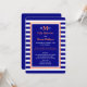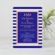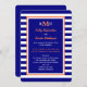 Este convite de recepção de casamento com listras apresenta um tema náutico com listras azuis e brancas no fundo. Os detalhes do seu convite aparecem em azul-marinho, que é bordeado em branco e coral. Você pode colocar seu monograma no topo e fornecer os detalhes de onde se casou, bem como os detalhes da recepção pós-casamento. Copyright henishouseofpaper