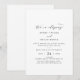 Este convite de recepção de fuga romântica com letra elegante é perfeito para uma festa simples após a fuga. O design minimalista preto e branco apresenta tipografia romântica sofisticada com estilo glamoroso moderno. Personalizável em qualquer cor. Mantenha o design minimalista e sofisticado, como está, ou personalize-o adicionando seus próprios gráficos e arte. Cartões de RSVP são vendidos separadamente, ou você pode adicionar informações de RSVP no verso do cartão.
