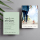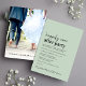 Convite de recepção e anúncio de casamento ou fuga minimalista moderno em verde sage. A frente apresenta "Festa Feliz para Sempre" em um script contemporâneo e tipografia ousada e moderna. Personalize sua mensagem e convite e adicione seus nomes em um script semelhante a uma assinatura. O verso apresenta sua foto de casamento, seus primeiros nomes e data de casamento.