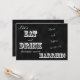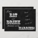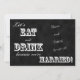 Este convite de recepção pós-casamento apresenta um design de quadro-negro preto e branco com as palavras "Vamos COMER e BEBER porque estamos CASADOS!" na frente, juntamente com um espaço para "escrever" seus nomes em diagonal no quadro-negro, junto com a data do casamento. No verso do convite de recepção pós-casamento estão os nomes pré-casamento da noiva e do noivo e onde eles se casaram, juntamente com os detalhes da recepção pós-casamento. Uma maneira moderna e divertida de convidar seus convidados para uma recepção pós-casamento. Copyright henishouseofpaper