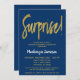 Um elegante, moderno convite de festas de aposentadoria surpresa preto e ouro. Texto do script de visão na parte superior e texto dourado abaixo com o nome em branco sobressalente