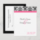 Cartão de RSVP para combinar com o nosso convite de casamento elegante rosa fuchsia, preto e branco, com sutil damasco floral e faixa horizontal colorida. Personalize online com os detalhes do seu casamento.