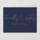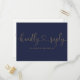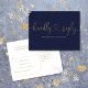 Um elegante convite de resposta em azul marinho e dourado com script em coração para RSVP. O verso apresenta seus detalhes e um divertido pedido de canção para o convidado. Criado por Thisisnotme©