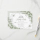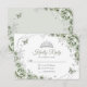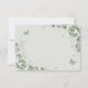 Cartão de resposta RSVP floral verde safira, prata e branco para festa de Quinceanera. Características, fonte de letra manuscrita, borboletas prateadas, rosas em aquarela e tiara. Perfeito para uma celebração glamorosa de princesa elegante. Personalize com seus próprios detalhes.