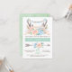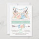 Convites de revelação de gênero de bebê com chifres florais vestidos com uma faixa e bandeirolas com texto rústico e flecha. Você pode personalizar facilmente este convite de revelação de gênero tribal simplesmente adicionando seus detalhes. Você também pode remover a camada de fundo do verso para adicionar a cor de sua escolha.