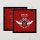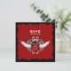 Anuncie o seu casamento com este convite de Save the Date não convencional em estilo rock and roll com guitarras elétricas cruzadas, asas e ornamentos vintage em vermelho e preto.