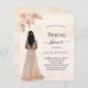 Um fundo rosa dourado, cor-de-rosa-claro. Uma noiva, rosas cor-de-rosa, grama-pampas. Personalize e adicione um nome e detalhes da parte. 1 folha = 1 convite impresso de borda a borda.