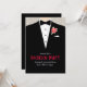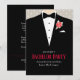 Convite de despedida de solteiro elegante com noivo gráfico usando terno e uma única rosa vermelha. Edite esses convites com suas próprias palavras, nome do noivo e detalhes do evento pré-casamento. © Design exclusivo e arte gráfica por Sarah Trett. www.sarahtrett.com para www.mylittleedenweddings.com