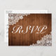 Cartão-postal de RSVP para a sua celebração. Estilo rústico com fundo de tábuas de madeira e decoração de renda branca. Mais itens estão disponíveis neste estilo em nossa loja. Você pode editar ainda mais o design, alterar cores, fontes e adicionar texto extra clicando no link "personalizar ainda mais".
