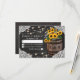 Cartões de resposta para casamento country elegantes com um fundo de quadro negro rústico, decoração de canto em renda de noiva, luzes cintilantes, girassóis amarelos de verão, um barril de vinho da vinícola com suas iniciais e um pedaço de corda amarrada.