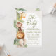 Dê as boas-vindas ao seu pequeno e celebre os futuros pais com este convite emocionante que apresenta animais da selva e da savana e folhagens verdes. Este é um design perfeito para o seu chá de bebê temático de animais selvagens.