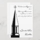 Um convite de salvar a data de casamento com uma ilustração gráfica em preto e branco de um campanário e cruz de igreja. O lado reverso apresenta uma igreja simplificada.