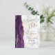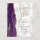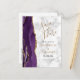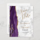 Este convite de salvar a data moderno e elegante apresenta uma borda de ágata aquarela roxa aparada com brilho dourado falso. O texto personalizável dourado e preto aparece em um fundo de mármore cinza e branco. O lado reverso repete as informações, juntamente com um endereço de devolução personalizável.