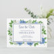 O Convite de Save the Date de Foto em Aquarela de Hortênsias Azuis é uma bela aquarela com hortênsias azuis e folhagens. Perfeito para um casamento de Primavera / Verão. Bela save the date floral! Você pode personalizar selecionando "Personalizar este modelo" ou se quiser personalizar ainda mais este design, selecione "Editar usando a ferramenta de design". Se precisar de itens correspondentes, por favor entre em contato.