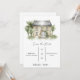 Este é um simples convite de save the date num fundo branco com uma pintura de uma mansão no topo. Contém o local, nome do casal e a data.