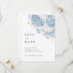 Este design de Save the Date em azul poeirento e branco apresenta flores de hortênsia em aquarela suave com um layout limpo e elegante.