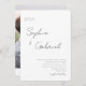 5 horas por dia, 7 dias por semana Convite de casamento simples e mínimo. Texto preto sobre fundo branco. Com a foto de volta. Parte de uma coleção de casamento.