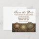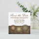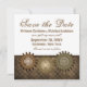 Anúncio de Steampunk com Engrenagens para Salvar a Data, frio e peculiar, em marrom escuro, apresentando um trio de engrenagens e um padrão xadrez desgastado. Este convite extravagante e elegante é perfeito para anunciar o seu casamento temático de Steampunk! Fácil de personalizar, basta adicionar os detalhes do seu casamento nos campos de texto fornecidos. Clique em "Personalizar" para encontrar opções adicionais de personalização.