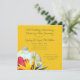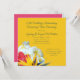 Convite de renovação de votos, cerimônia de aniversário com design floral havaiano. Amarelo dourado com texto branco e um grande buquê de plumeria, hibisco e ave-do-paraíso no canto inferior. Cartões quadrados podem ter cantos arredondados e fontes são modernas, escrita à mão com texto impresso em maiúsculas. Inclua um parágrafo separado para informações de recepção, se necessário. O verso é rosa escuro sólido.