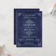 Simples e elegante convites de casamento com espirais finas e ricos que lembram a vintage art deco design e o novo texto verde de menta contra um fundo texturizado de quadro azul marinho.