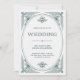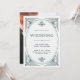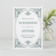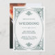 Estes convites de casamento glamourosos apresentam um spin moderno em deco de arte clássico. Uma imagem geométrica verde festiva e ornamentado e ornamentação decoram um elegante fundo prateado/branco para um espetáculo de casamento dramático, glamouroso e vintage de 1920 que é perfeito para o seu casamento de Natal. Sua foto vai para o fundo.