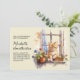 Convite de aniversário para mulheres com pintura em aquarela de um gatinho amarelo fofo sentado no parapeito da janela com uma caixa de flores roxas.