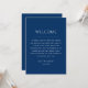 This sophisticated double sided wedding itinerary card in deep blue brings a sense of classic elegance and refined style to your wedding stationery. The rich hue, also known as navy, evokes feelings of depth, tranquility, and timeless beauty. Ideal for couples seeking a sophisticated and elevated atmosphere. One side of the card presents the wedding day timeline, clearly outlining the key moments of the day - from the ceremony to the reception, ensuring that guests are informed and can enjoy the day without wondering what comes next. The clean, structured design of the schedule makes it both functional and stylish. The reverse side features a welcome message. Perfect for beach weddings, nautical themed celebrations, and destination weddings by the water. This card is a chic addition to any coastal setting, adding both sophistication and a relaxed seaside vibe. Available as both a printed card and a digital download.