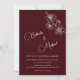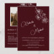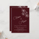 Minimalist design with white floral sketch cherry blossoms and on a deep burgundy background. Modern botanical hand drawn wedding invitation with bride and groom names in an elegant calligraphic script. With your photo on the backside.