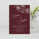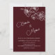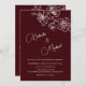 Minimalist design with white floral sketch cherry blossoms and on a deep burgundy background. Modern botanical hand drawn wedding invitation with bride and groom names in an elegant calligraphic script. With your photo on the backside.