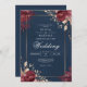This design features rich, deep red floral accents against a sophisticated navy background. A delicate metallic border frames the composition, evoking a sense of opulent romance.