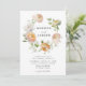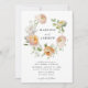Convites florais elegantes com nomes rodeados por uma coroa de flores aquáticas e folhagem em tons de pêssego, marfim, laranja, rosa-pincel, roxo, amarelo e verde. Personalize o convite de casamento floral do primavera com os detalhes de seu casamento. O convite floral incrível é perfeito para casamentos de primavera e jardim de verão.