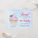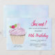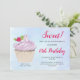 Um convite de festa de aniversário com uma ilustração de um delicioso cupcake com redemoinhos cor-de-rosa e uma fruta com folhas aninhadas no glacê. Situado em um fundo de aquarela azul pastel claro.